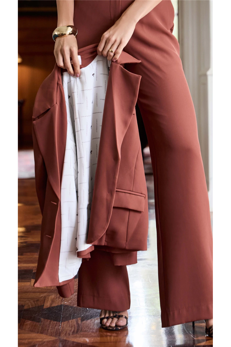 Composição: alfaiataria com elastano (97% poliéster, 3% elastano)