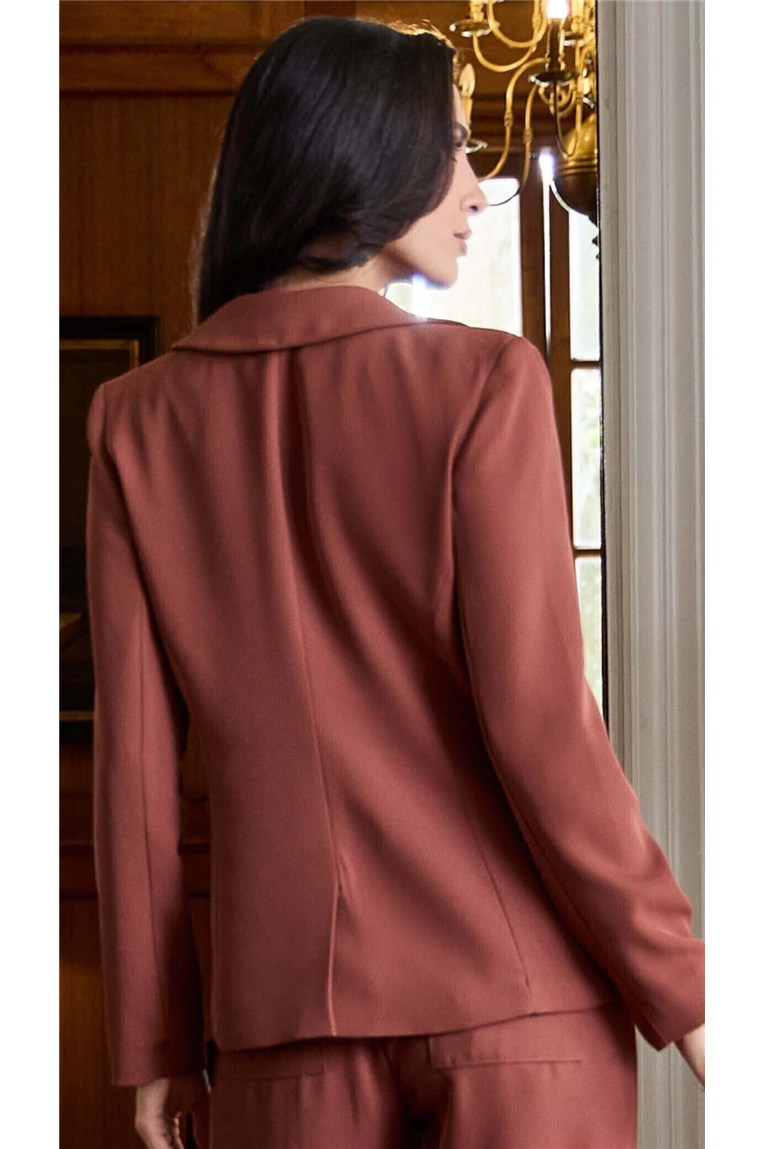 Blazer gola V com lapela, ombreiras estruturadas e manga longa. Contém bolsos frontais com lapela e recortes laterais, fechamento frontal com botões de metais orgânicos. Além disso, apresenta uma fenda no centro das costas, totalmente forrado (forro: 100% poliéster).
