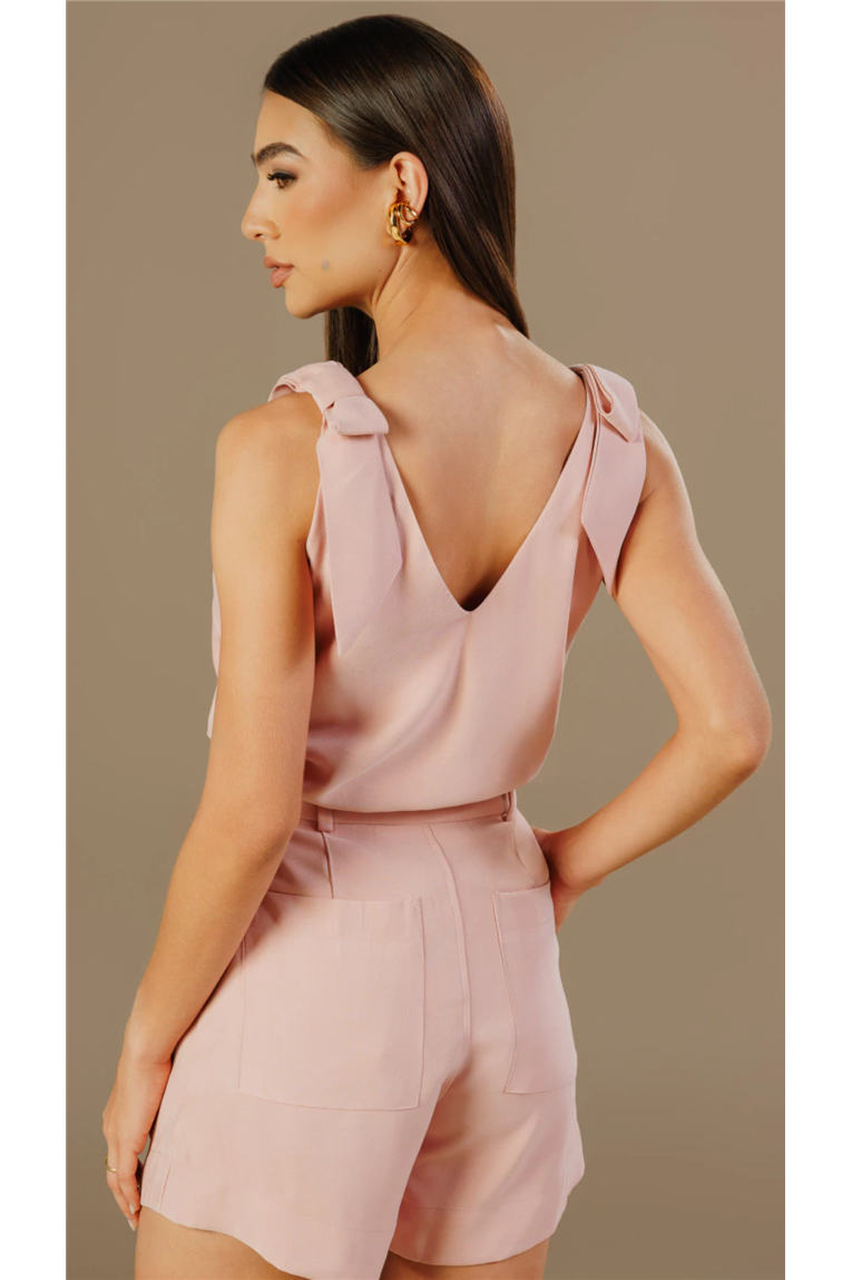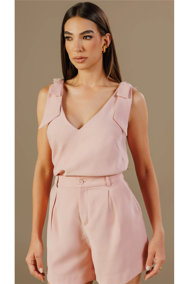 Blusa decote com caimento estruturado e leve. Possui modelagem reta com decote em V profundo, alças são largas com aplicação de laços fixos nos ombros. Além disso, conta com pences frontais para melhor ajuste ao busto e ao tronco. Comprimento regular, indicado para uso por dentro ou por fora. Sem fechamento, vestibilidade por sobreposição.