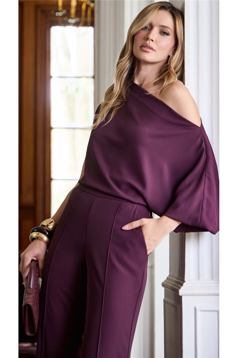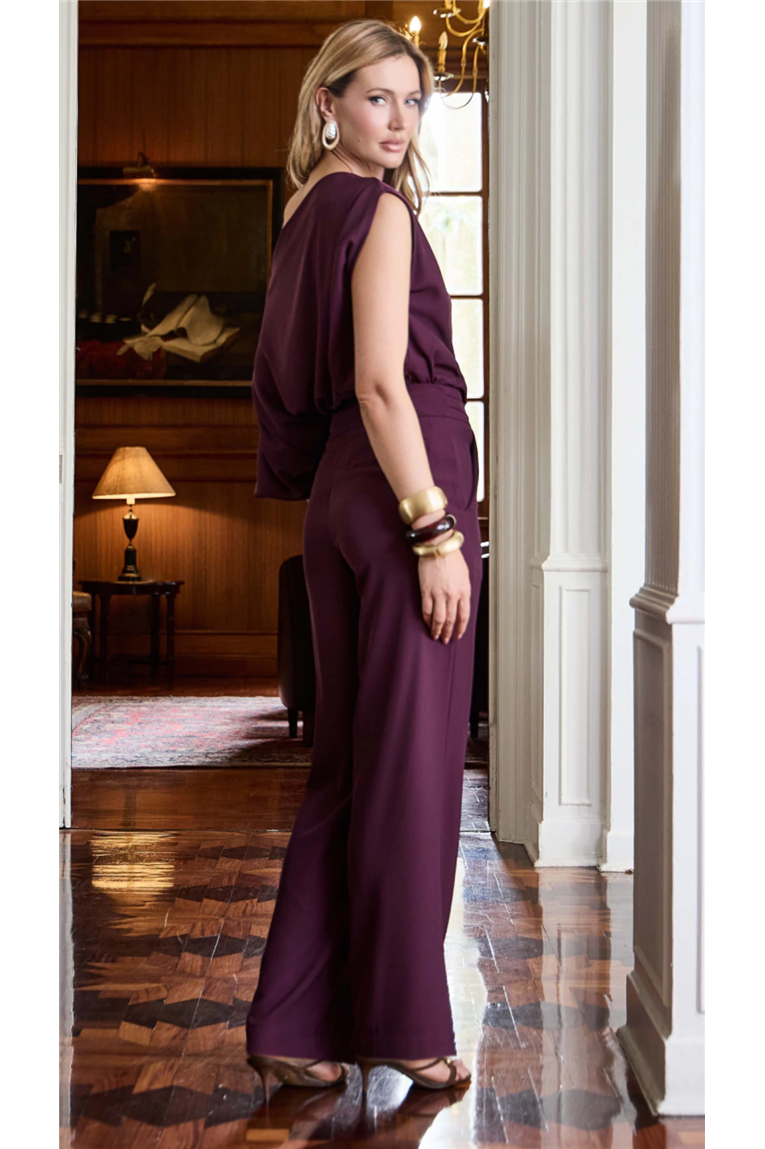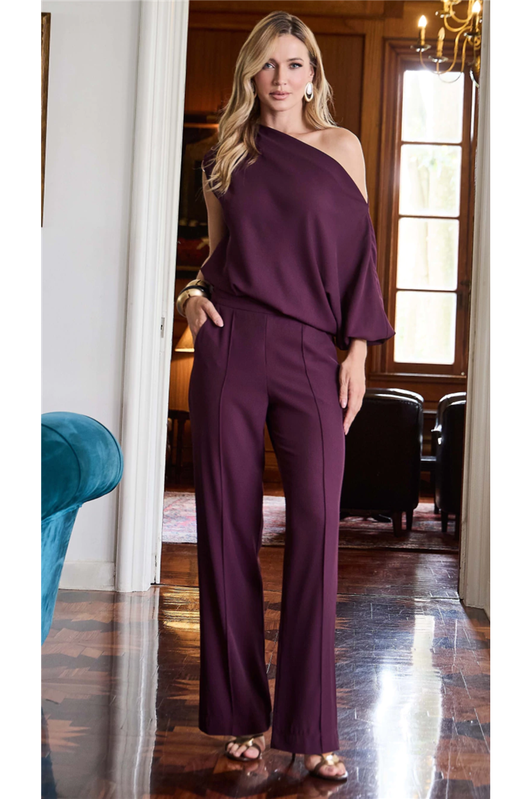Conjunto confeccionado em tecido alfaiataria com blusa de modelagem assimétrica e decote de um ombro só, manga longa única com punho de pregas. Já a calça possui modelagem reta, cintura média, nervuras no cós e nas pernas, além de bolsos faca laterais e fechamento lateral por zíper.