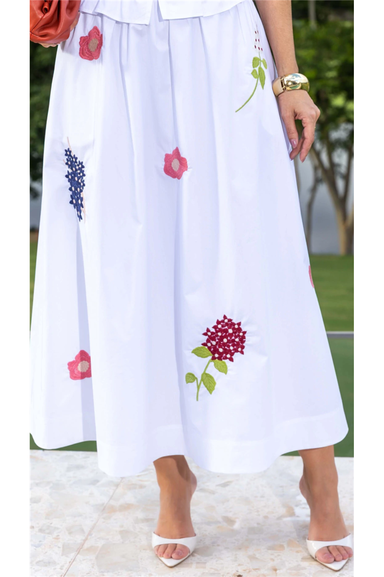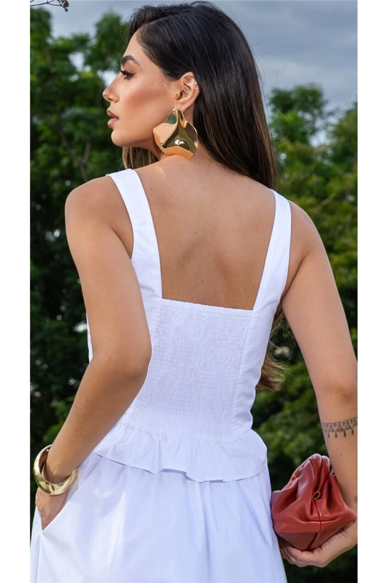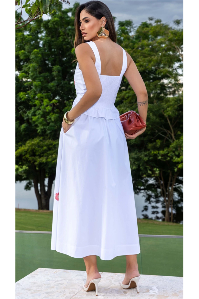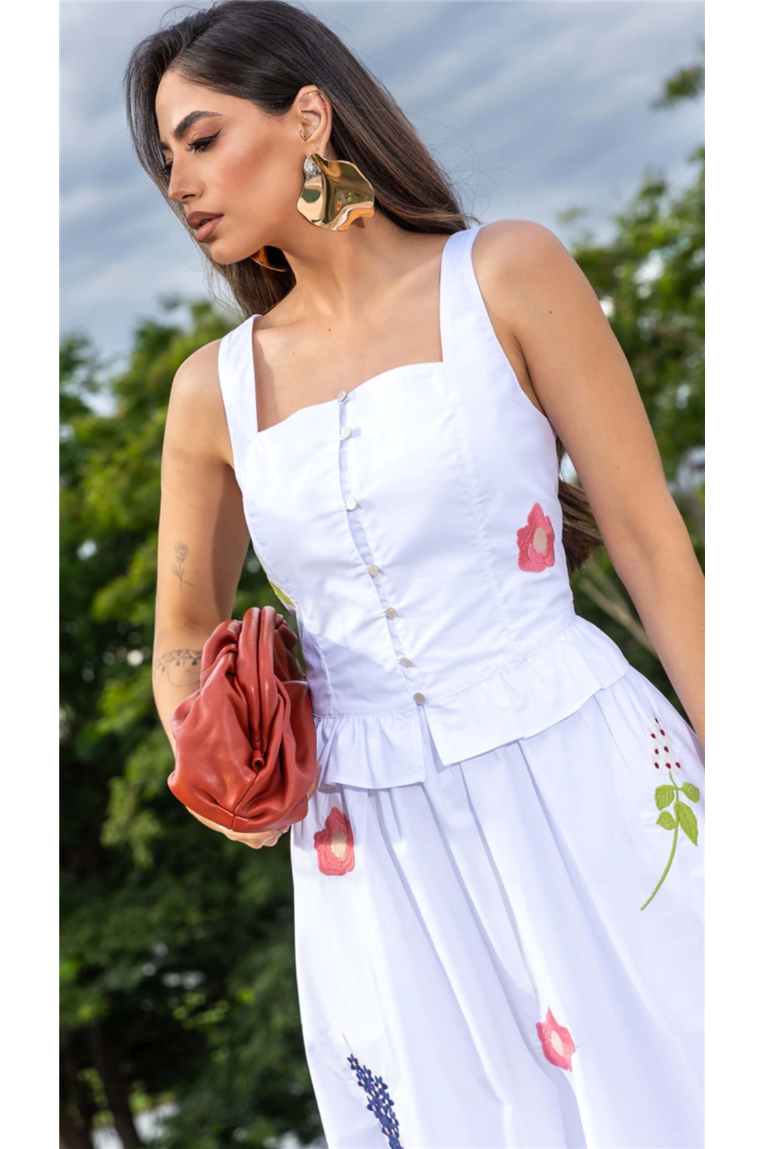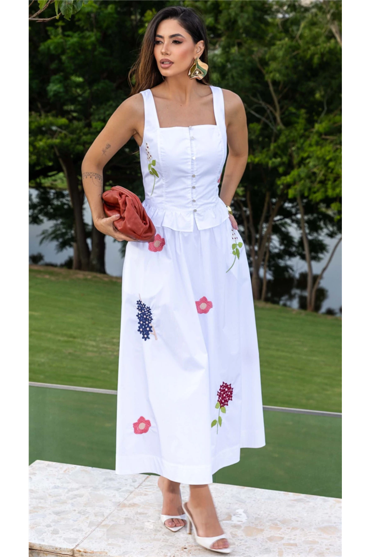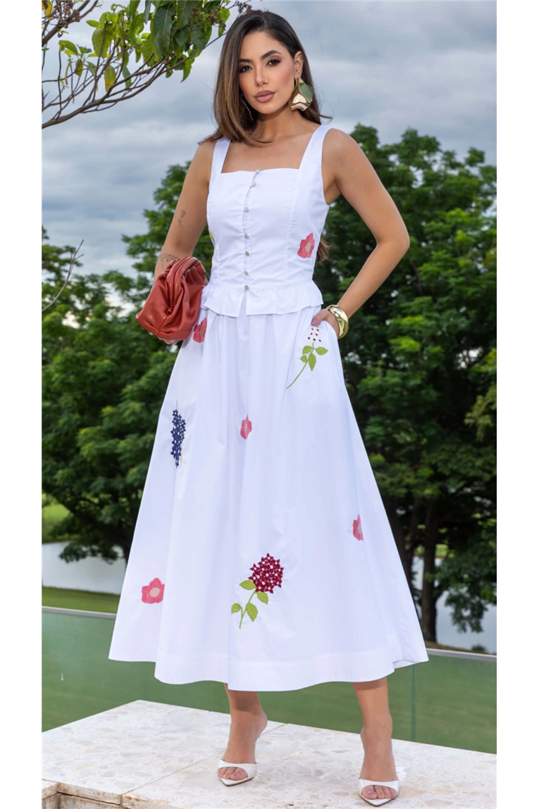 A blusa apresenta modelagem reta, decote reto, alças largas e recorte peplum com babadinho, além de abotoamento frontal e lastex nas costas, proporcionando ajuste perfeito ao corpo. A saia midi, com modelagem evasê e cintura média, destaca-se pelos detalhes bordados exclusivos e pelo forro, garantindo discrição e conforto no uso. O tecido tricoline em algodão oferece toque macio, frescor e excelente caimento.