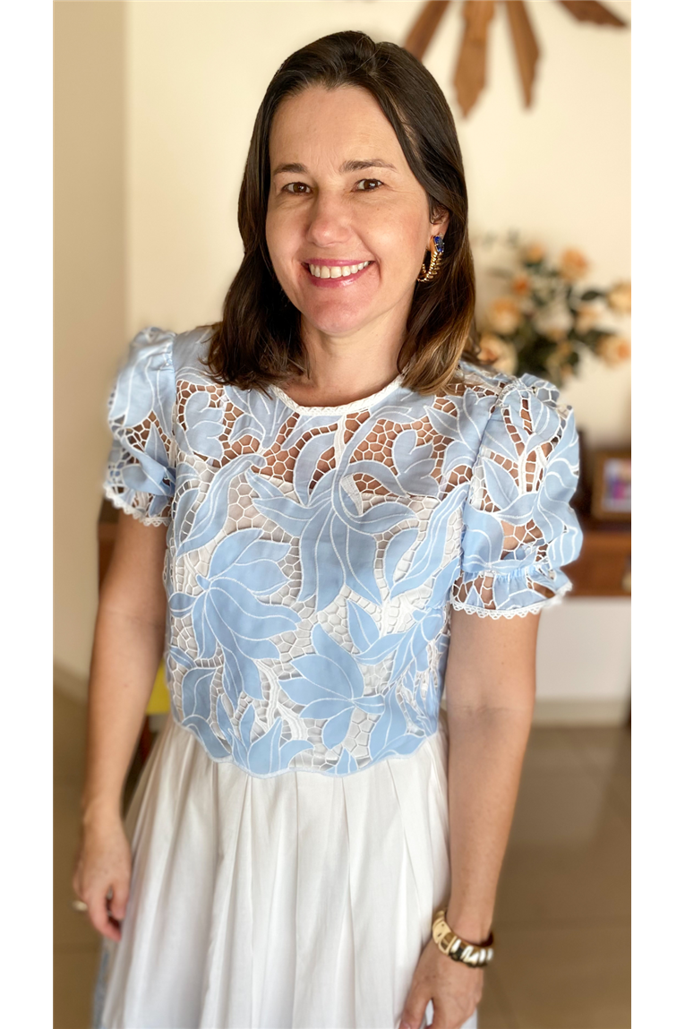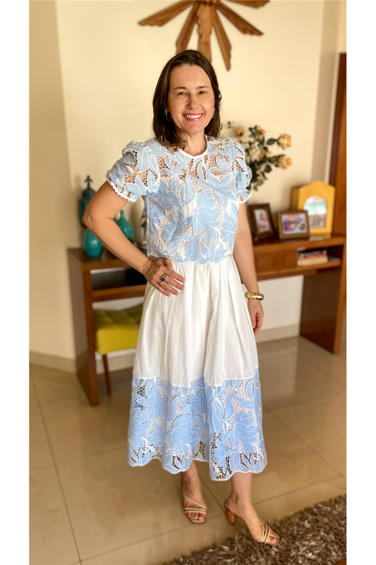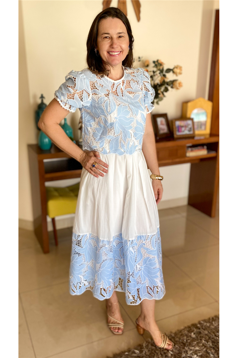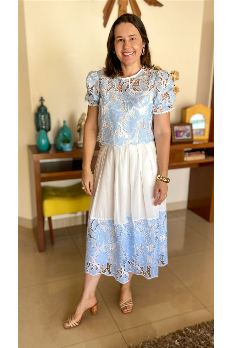 Composição: VARIANTE AZUL. Voil bordado: 95% poliéster, 5% elastano. Voil liso: 100% algodão. Forro: 95% poliéster, 5% elastano.