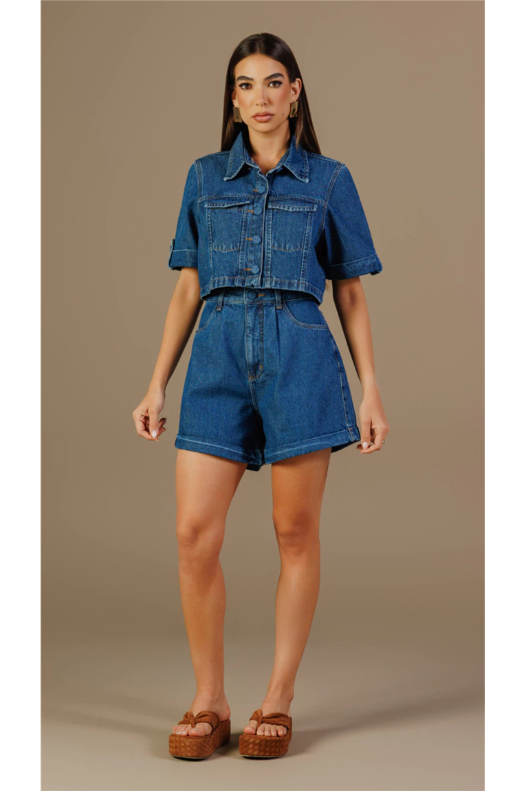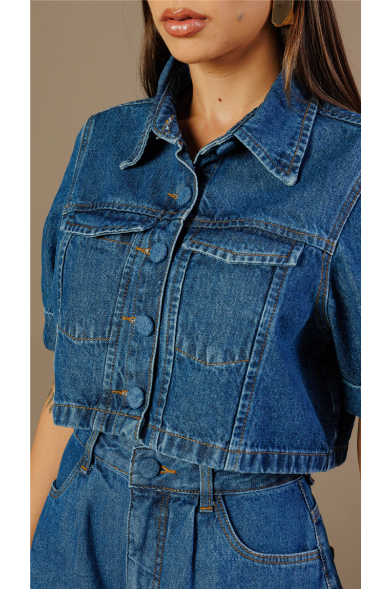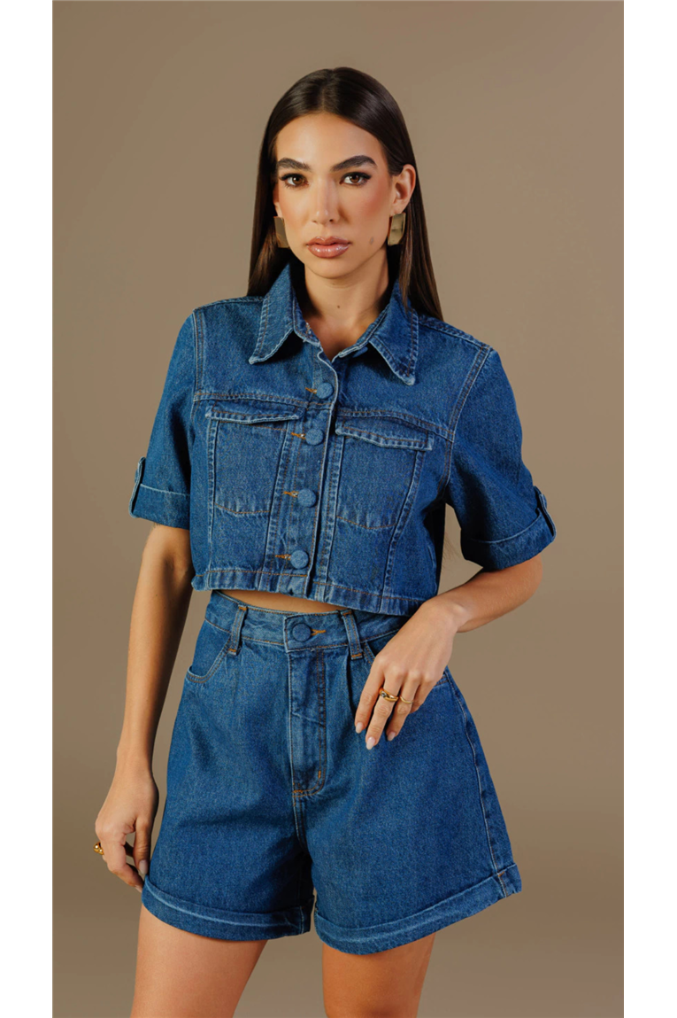 Jaqueta confeccionada em tecido jeans, com modelagem cropped e caimento estruturado. Possui gola tradicional tipo camisa, pesponto marrom, dois bolsos frontais, mangas curtas dobradas, ambas com martingale, permitindo o ajuste da manga como na referência visual, além de fechamento frontal por botões encapados.