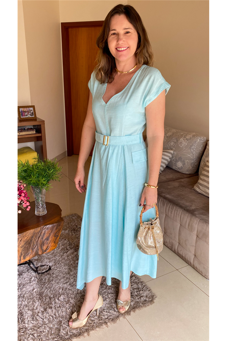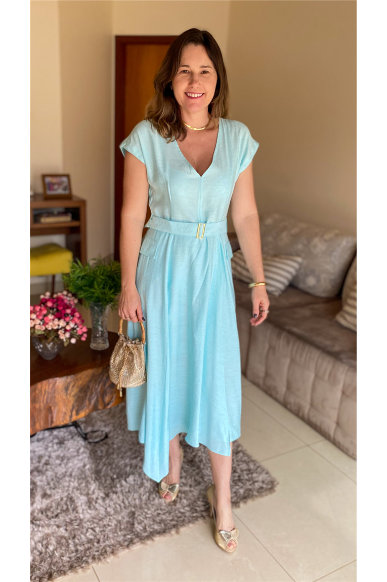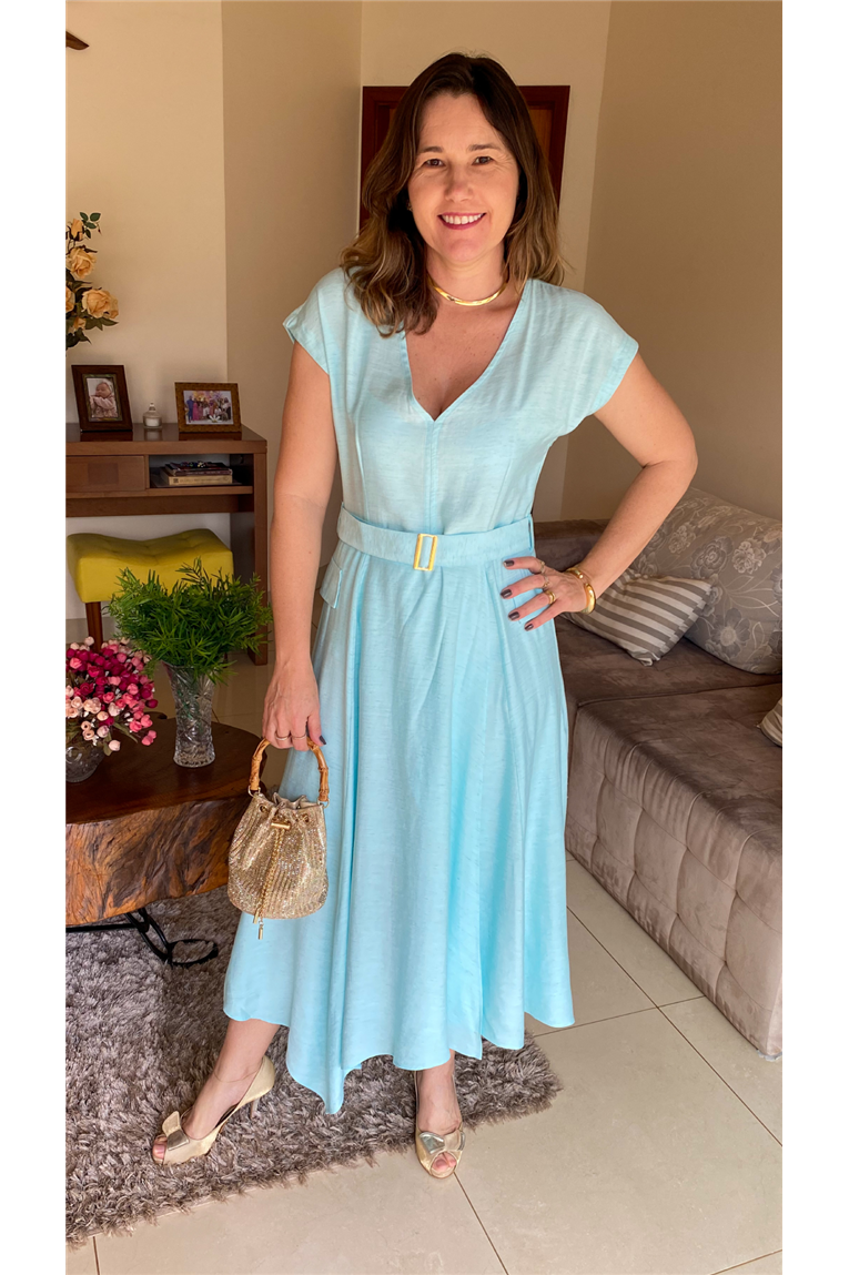 Vestido em viscolinho com modelagem da saia em evasê. Possui decote em V. Fechamento nas costas com zíper.Acompanha cinto faixa.Cor: azul.