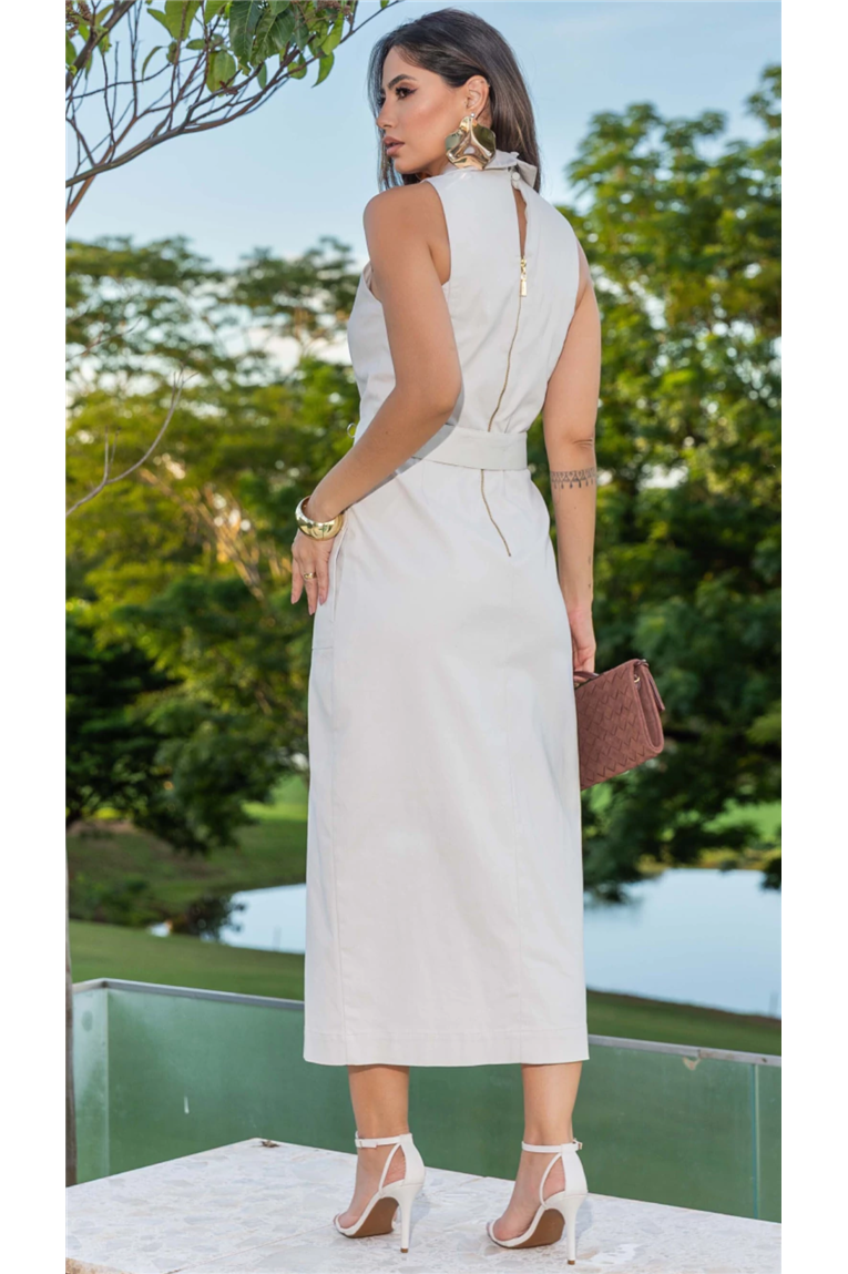 Confeccionado em tecido sarja, com caimento impecável e modelagem reta. O comprimento midi valoriza a silhueta, enquanto o decote V e a gola smoking trazem um toque sofisticado e moderno ao visual. Sem mangas, possui bolsos cargos laterais, além de uma fenda frontal que garante leveza e movimento. O fechamento nas costas é feito por zíper de metal e botão, oferecendo segurança e fácil ajuste. A peça é totalmente forrada para maior conforto e acabamento refinado.