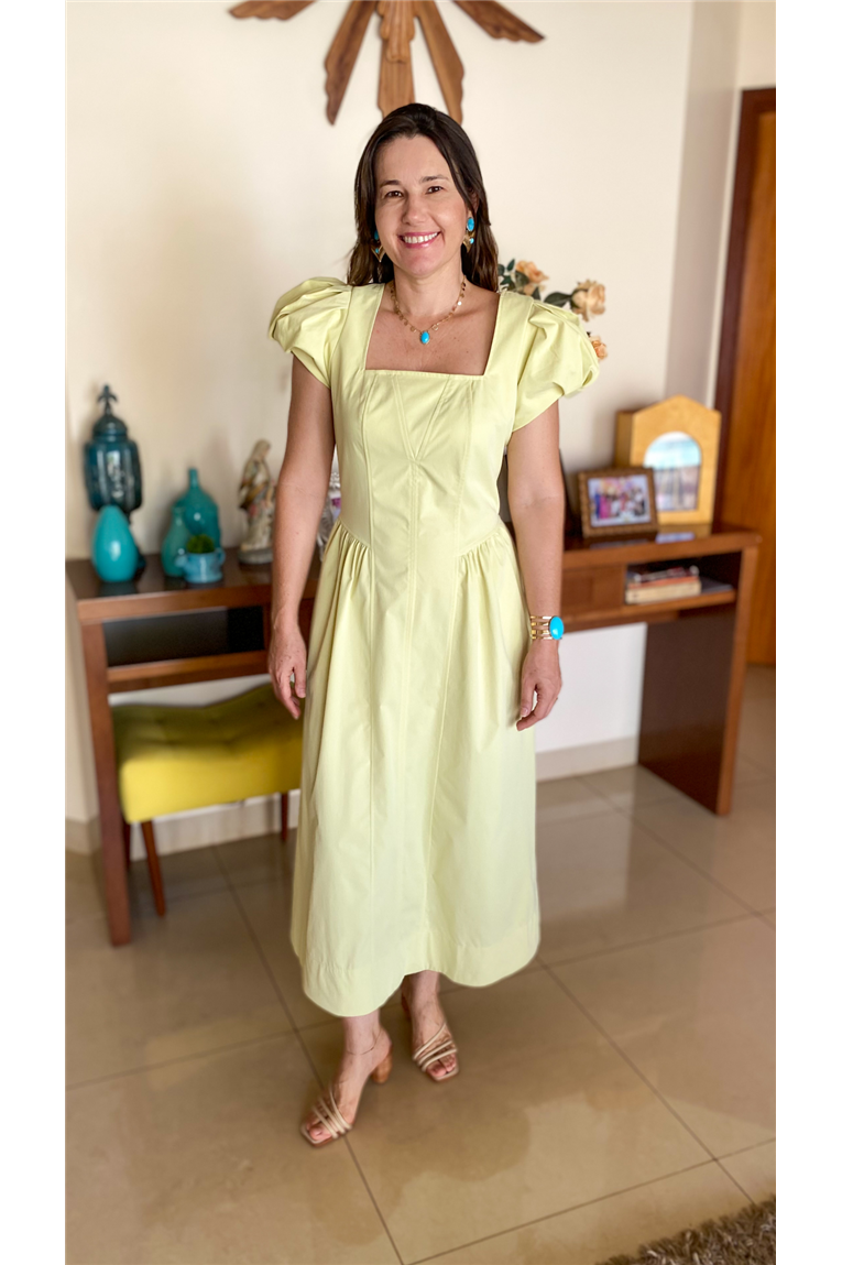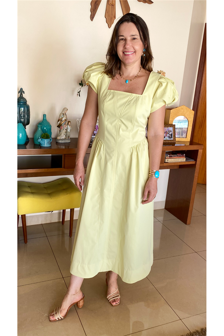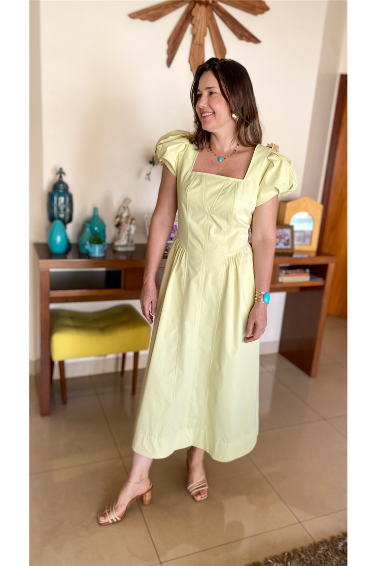 Vestido em sarja sem elastano, modelagem evasê, comprimento midi, decote quadrado, mangas curtas balonê, recortes corpo frente e costas, fechamento nas costas por zíper.